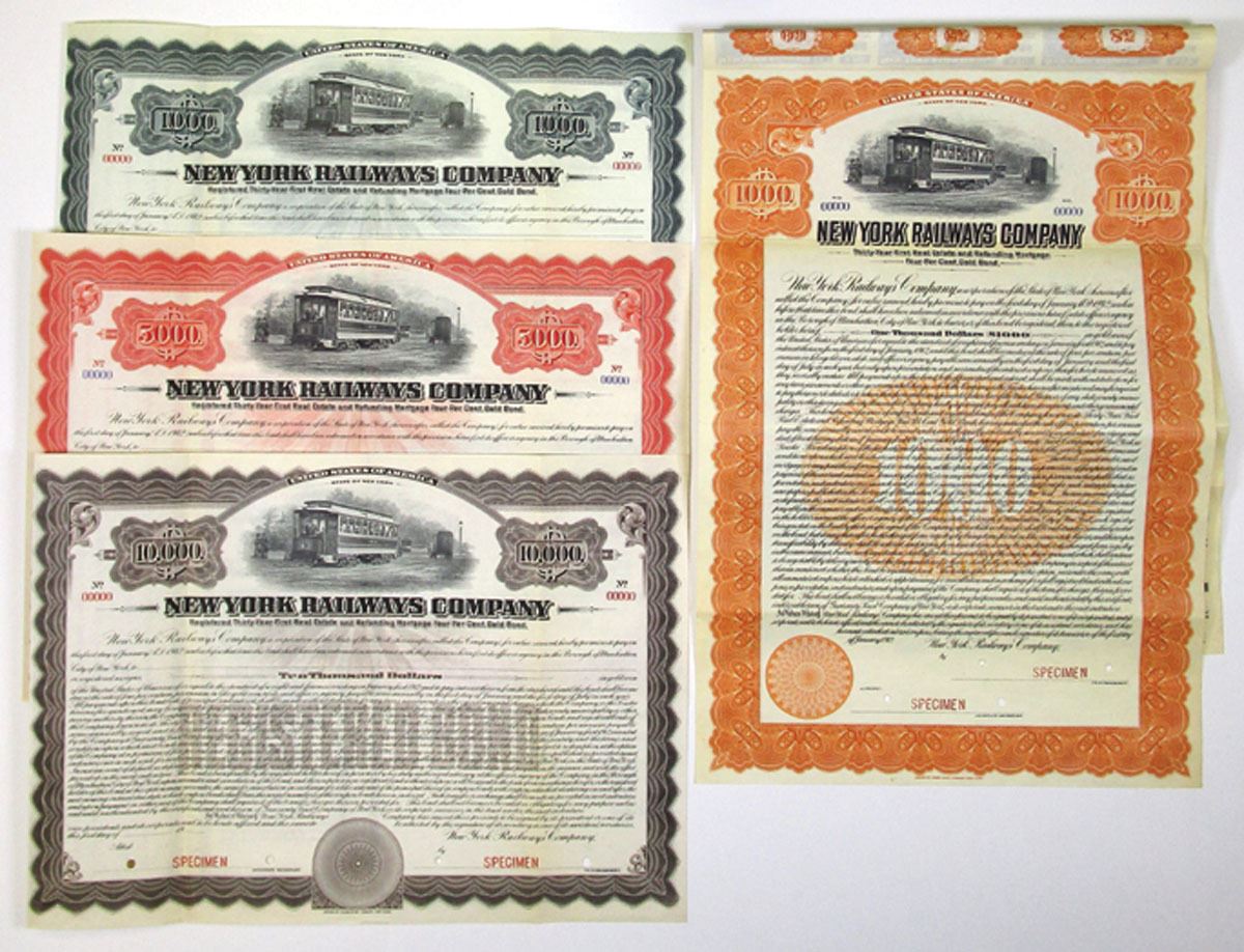 New York, 1912, Lot of 4 Specimen Bonds, Includes: $1000 4% Thirty Year First Real Estate and Refunding Mortgage Gold Coupon Bond, Black with orange border; $1000 Registered 4% Thirty Year First Real Estate and Refunding Mortgage Gold Bond, Black with steel blue border; $5000 Registered 4% Thirty Year First Real Estate and Refunding Mortgage Gold Bond, Black with red border; $10,000 Registered 4% Thirty Year First Real Estate and Refunding Mortgage Gold Bond, Black with dark brown border. All have rail car at top, Specimen overprints, POCs, are in XF to AU condition, printed by ABNC. (4). Sold "AS IS" no returns accepted. All 4 of these certificates are unlisted in Cox and all are rare. These have never been offered at auction previously.