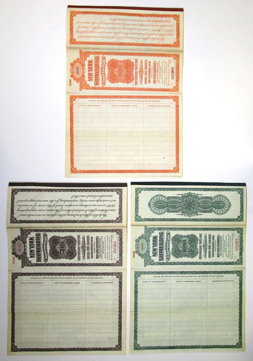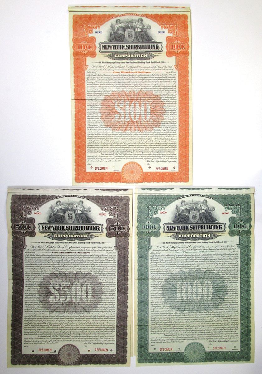 New York, 1916. Lot of 3 Specimen 5% First Mortgage Sinking Fund Gold Coupon Bonds: $100 in orange; $500 in brown; and $1000 in green. All have red specimen overprints, 00000 serial numbers, and POCs. VF-XF condition, ABNC. The New York Shipbuilding Corporation was an American shipbuilding company that operated from 1899 to 1968, ultimately completing more than 500 vessels for the U.S. Navy, the United States Merchant Marine, the United States Coast Guard, and other maritime concerns. (3)