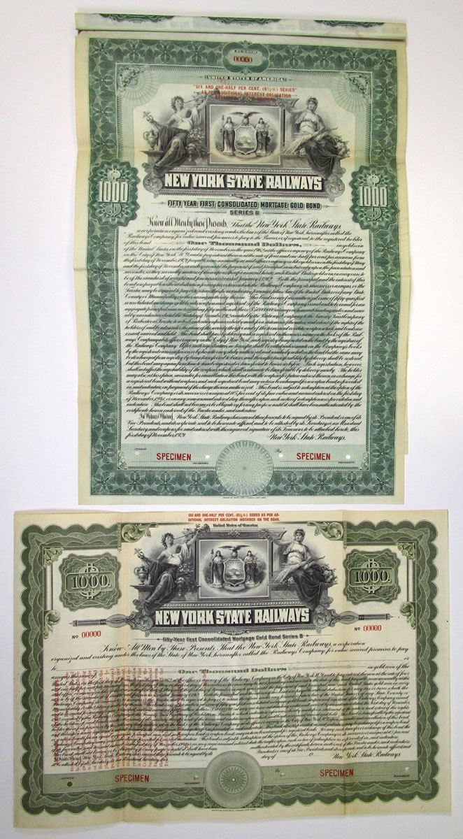 New York , 1921, Lot of 2 Specimen Bonds, Includes: $1000 4 /12% Series B Fifty Year Consolidated Mortgage Gold Coupon Bond, Black with green border; and, $1000 Registered 4 1/2% Fifty Year Consolidated Mortgage Gold Bond, Black with olive green border. Both have "6 1/2% Series as per additional interest obligation inscribed on the bond' overprints at top, allegorical figures flanking arms of New York in frame at top, Specimen overprints, POCs, are in XF to AU condition, printed by ABNC. Attractive railroad bond pair. Both unlisted and rare with only 2 examples of each found in the ABN Archives.