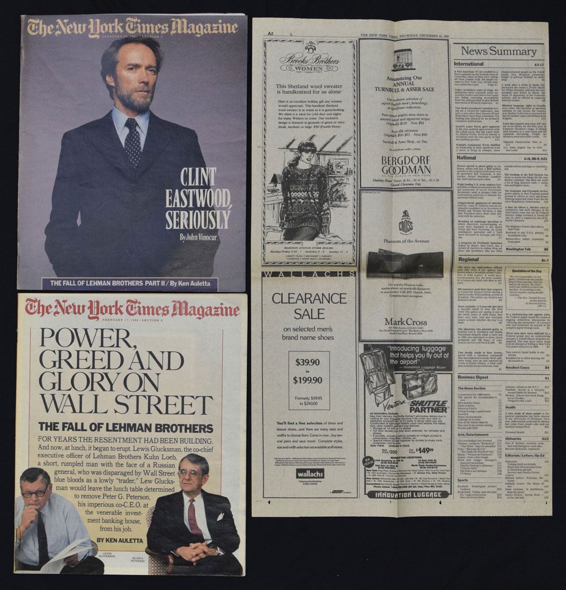 New York..., 1985-88. Lot of 3 Items, Includes: New York Times Magazine from February 17, 1985 & February 24, 1985, Both magazines have cover articles about the "Fall of Lehman Brothers" split into Part 1 and Part 2; Front page of New York Times from Thursday December 22, 1988 with articles about a Jetliner crash in Scotland, Pentagon Officials and Secret Data, and Drexel settlement. Documents range from VF to XF condition. (3). Sold "AS IS" no returns accepted.