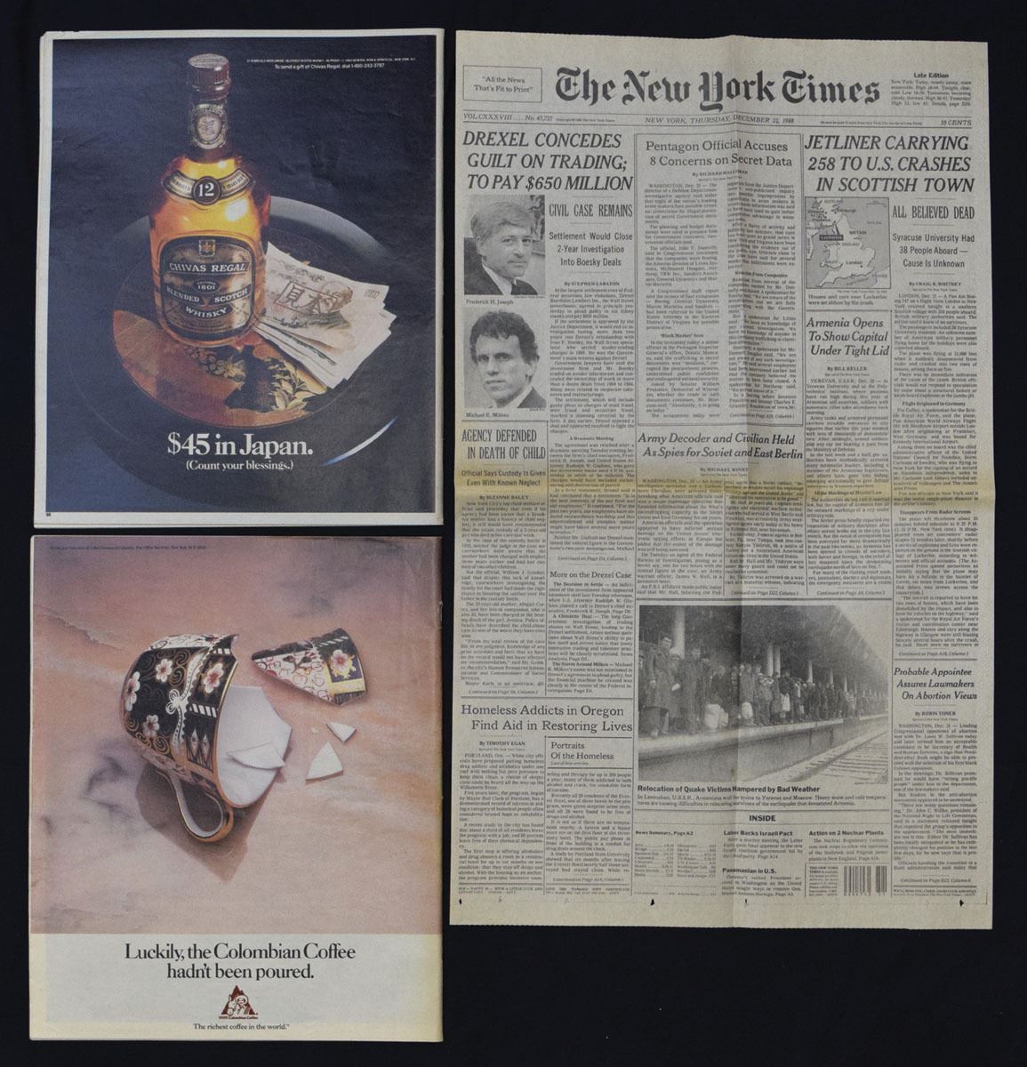 New York..., 1985-88. Lot of 3 Items, Includes: New York Times Magazine from February 17, 1985 & February 24, 1985, Both magazines have cover articles about the "Fall of Lehman Brothers" split into Part 1 and Part 2; Front page of New York Times from Thursday December 22, 1988 with articles about a Jetliner crash in Scotland, Pentagon Officials and Secret Data, and Drexel settlement. Documents range from VF to XF condition. (3). Sold "AS IS" no returns accepted.