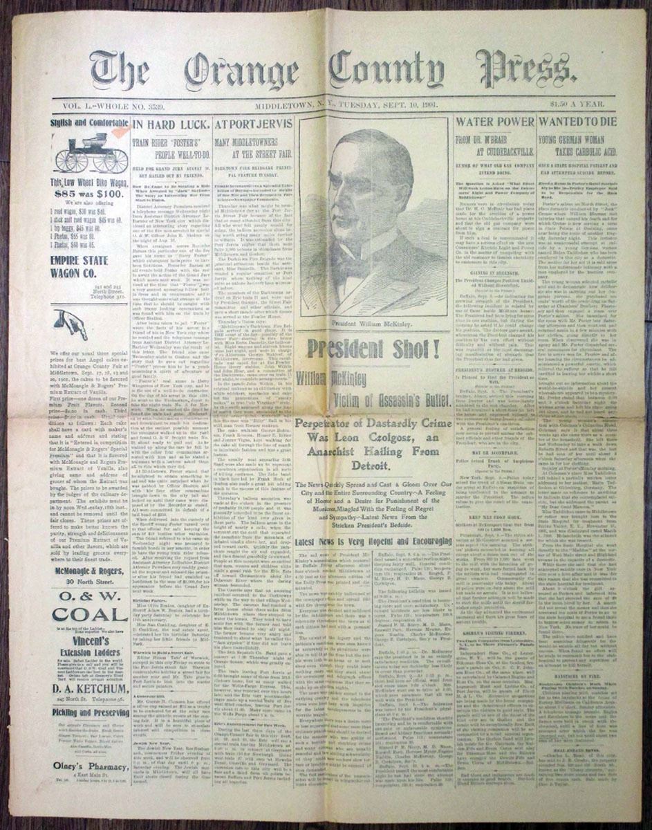 New York, September 10, 1901. Orange County Press newspaper which includes a front page article on President William McKinley's assassination by Leon Czolgosz. Also includes news and articles related to Orange County, New York. William McKinley (January 29, 1843 – September 14, 1901) was the 25th president of the United States from 1897, until his assassination in 1901. During his presidency, McKinley led the nation to victory in the Spanish–American War, raised protective tariffs to promote American industry, and kept the nation on the gold standard in a rejection of the expansionary monetary policy of free silver. His legacy was suddenly cut short when he was shot on September 6, 1901 by Leon Czolgosz, a second-generation Polish-American with anarchist leanings. McKinley died eight days later and was succeeded by Vice President Theodore Roosevelt. As an innovator of American interventionism and pro-business sentiment, McKinley's presidency is generally considered above average, though his highly positive public perception was soon overshadowed by Roosevelt.