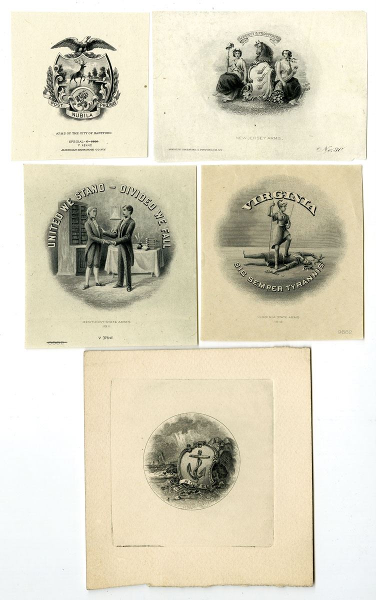 Lot of 5 Proof Vignettes of State and City arms, Includes: Kentucky Arms, Virginia State Arms, New Jersey Arms, Rhode Island Arms, and Arms of the City of Hartford. Vignettes are printed on India paper with only 1 mounted on cardstock. Used on banknotes, stocks, bonds, checks, and other documents and range from XF to AU condition. (5). Sold "AS IS" no returns accepted.