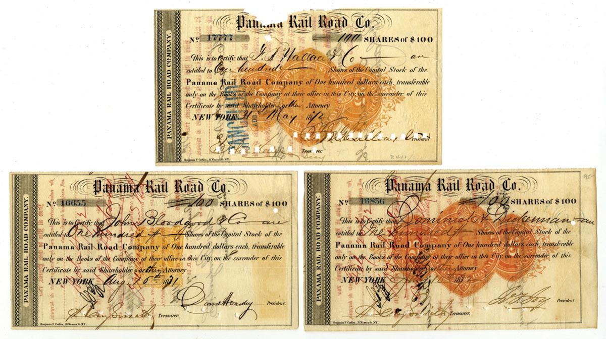 Panama (Incorporated in NY), 1871 and 1872. Lot of 3, I/C Stock Certificates for 100 Shares each, All have title at top with large imprinted revenue at center, POCs and hand written cancelled, 1 has a 25 Cents, RN-T4 imprinted revenue and the other 2 certificates have 25 Cents, RN-U1 revenue imprints, all are in VF condition or better. (3). Sold "AS IS" no returns accepted.
