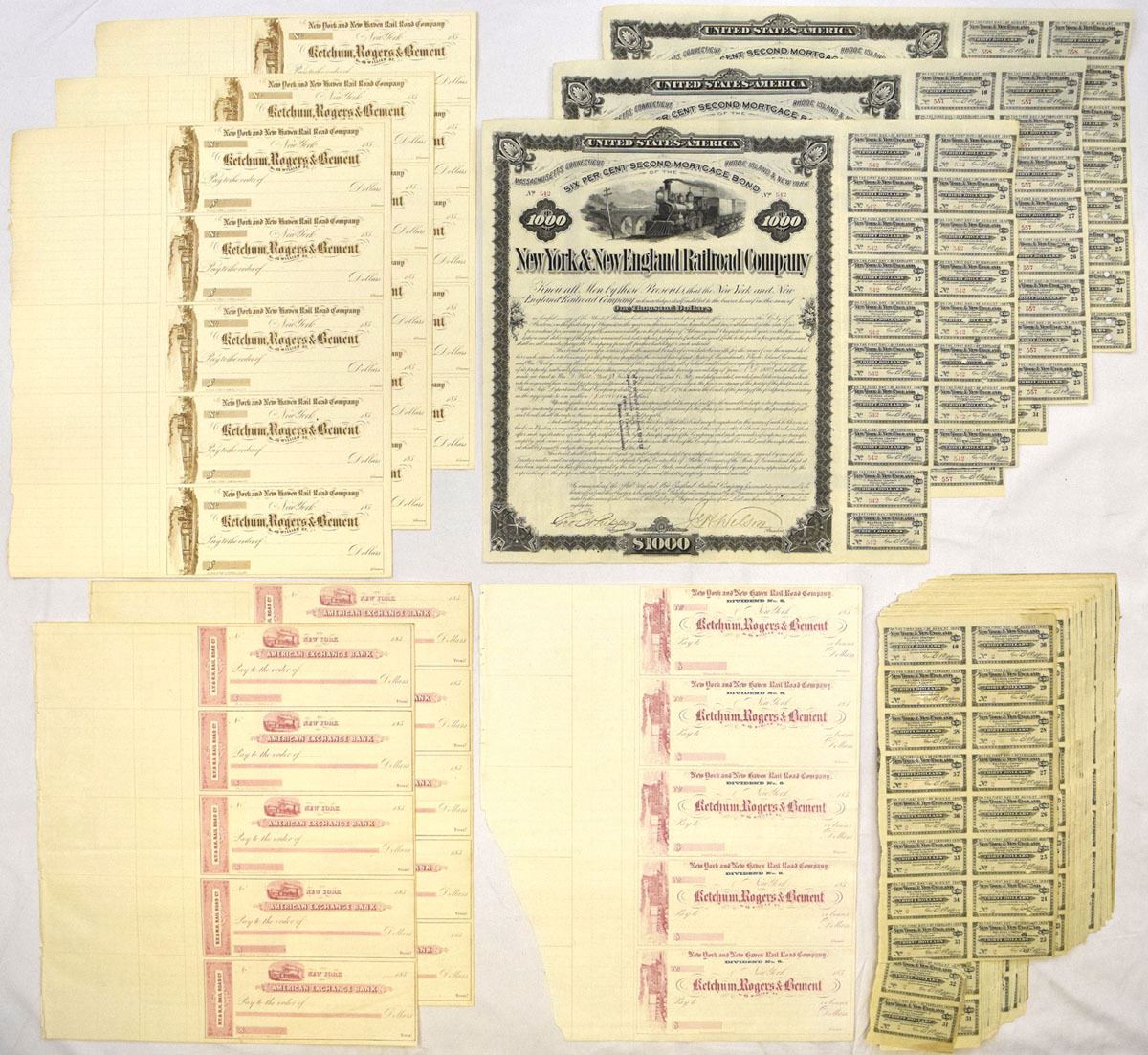 New York, ND (1850s-80s). Lot of 48 Bonds and Unissued Checks, Includes: New York & New England Railroad Co., 1882, $1000 I/C Coupon Bonds (3), S/Ns 542, 557, & 558, Also includes coupons for S/Ns 2-38 & 501; New York and New Haven Rail Road Co., ND (ca.1850s), Sheet of 5 Uncut Dividend Checks with red print; ND (1850s), Sheets of 5 Uncut Checks with brown print (4); American Exchange Bank, ND (ca.1850s), Uncut Sheets of 5 Checks (2). Bonds and Checks range from VF to XF condition. (48). Sold "AS IS" no returns accepted.