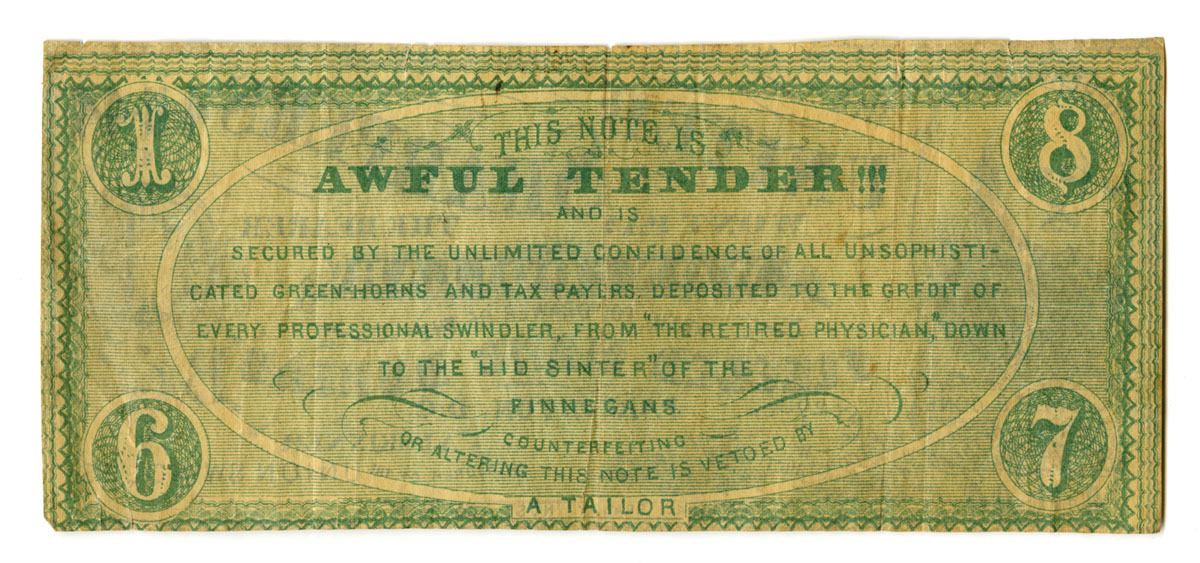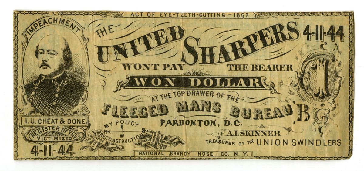 New York, 1867. Satirical political “banknote” styled as currency, reading “The United Sharpers Won’t Pay the Bearer Won Dollar at the Top Drawer of the Freed Man’s Bureau, Washington, D.C.” with caricature portrait of Union General Benjamin Butler with an extensive parody text referencing impeachment, Reconstruction, and federal agencies. Engraved in the style of contemporary banknotes, this piece was produced as political propaganda rather than legal tender and circulated as a handbill or keepsake during the impeachment crisis of 1867 to 1868. A striking example of Reconstruction-era political satire. Fine to VF condition.