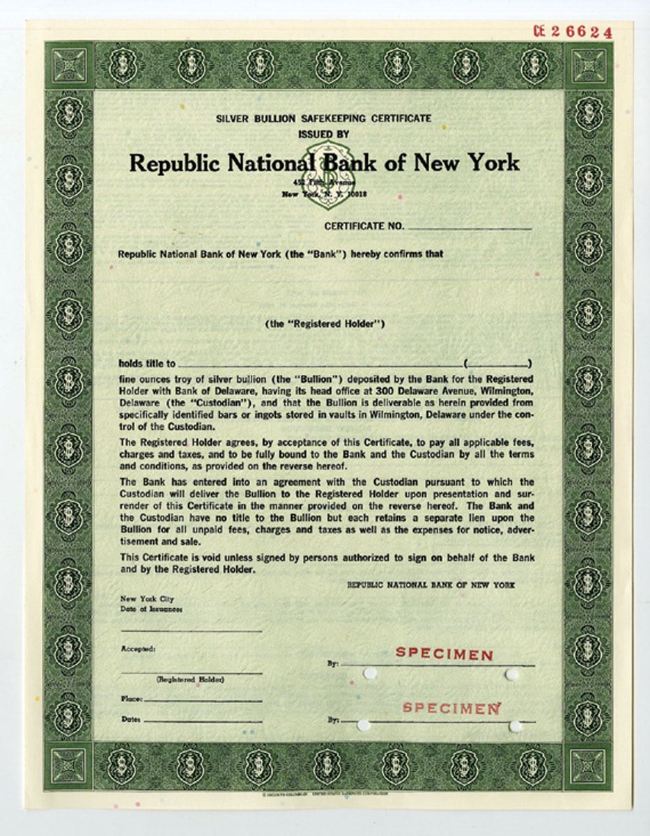 Republic National Bank of New York, 1970s Silver Bullion Specimen Cert.- Green