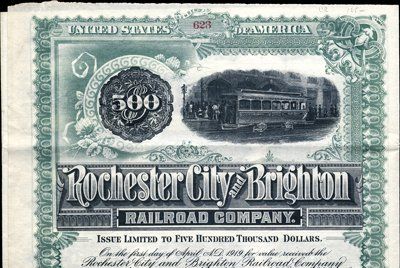 Rochester City and Brighton Railroad Co. 1889. $500. Specimen 6% Bond "Issue Limited to $500,000". Green brown border. Street car on upper right. XF condition. POC's. Red "Return to Record & Specimen Dept." on back. Coupons attached. Rare certificate. HLBNC.