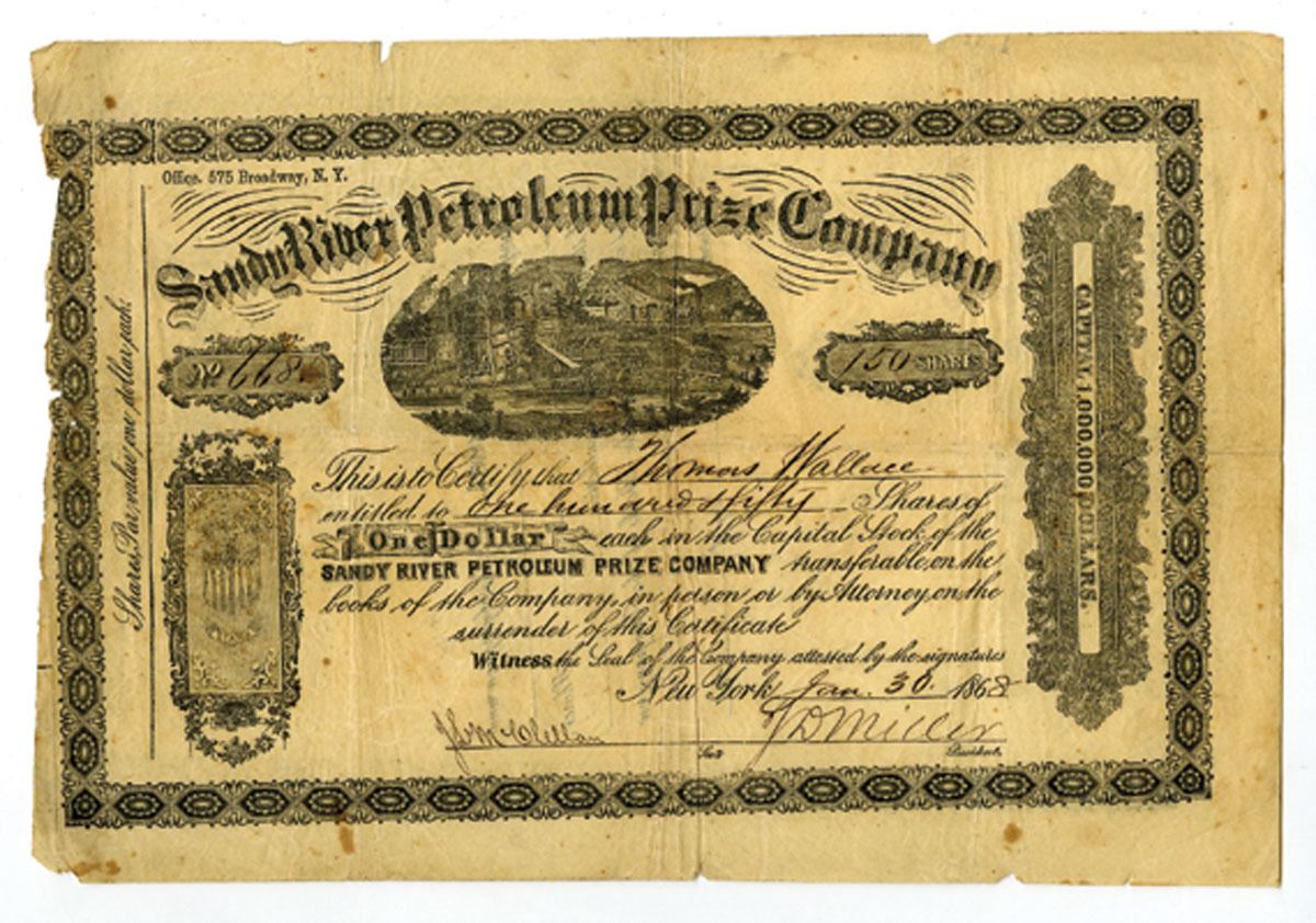 New York, 1868. 150 Shares Capital Stock I/U Certificate, Black print with black border and oil rig/refinery set up at top center, S/N 668, Certificate is in Good to Fine condition with tears, rips, and stains.