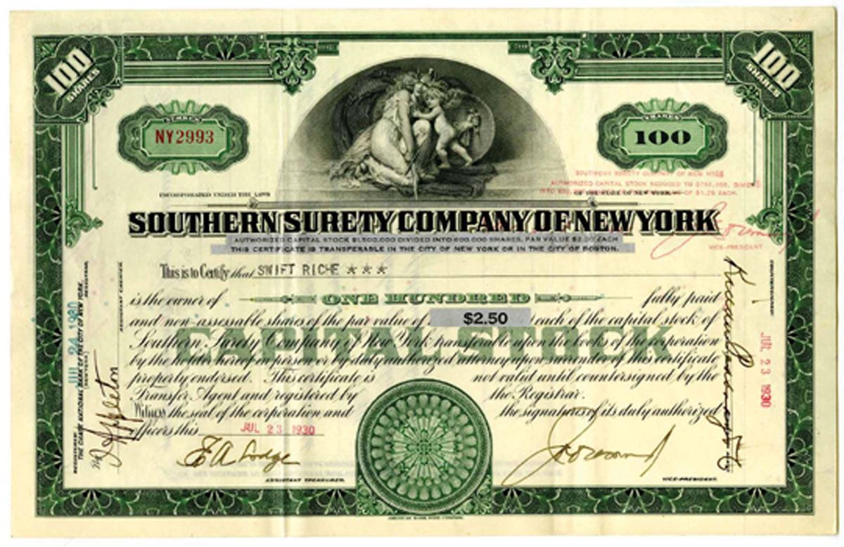 New York, 1930. 100 Shares I/U Capital Stock Certificate, Black text with green border and underprint, Allegorical woman with child at top center. Fine condition, ABNC.