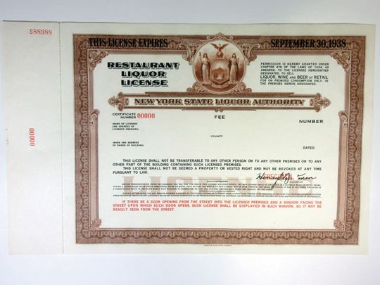 New York, 1938. Specimen Restaurant Liquor License, Brown border and underprint with seal of NY at top, Specimen overprint, S/N S88988, XF condition, ABNC.