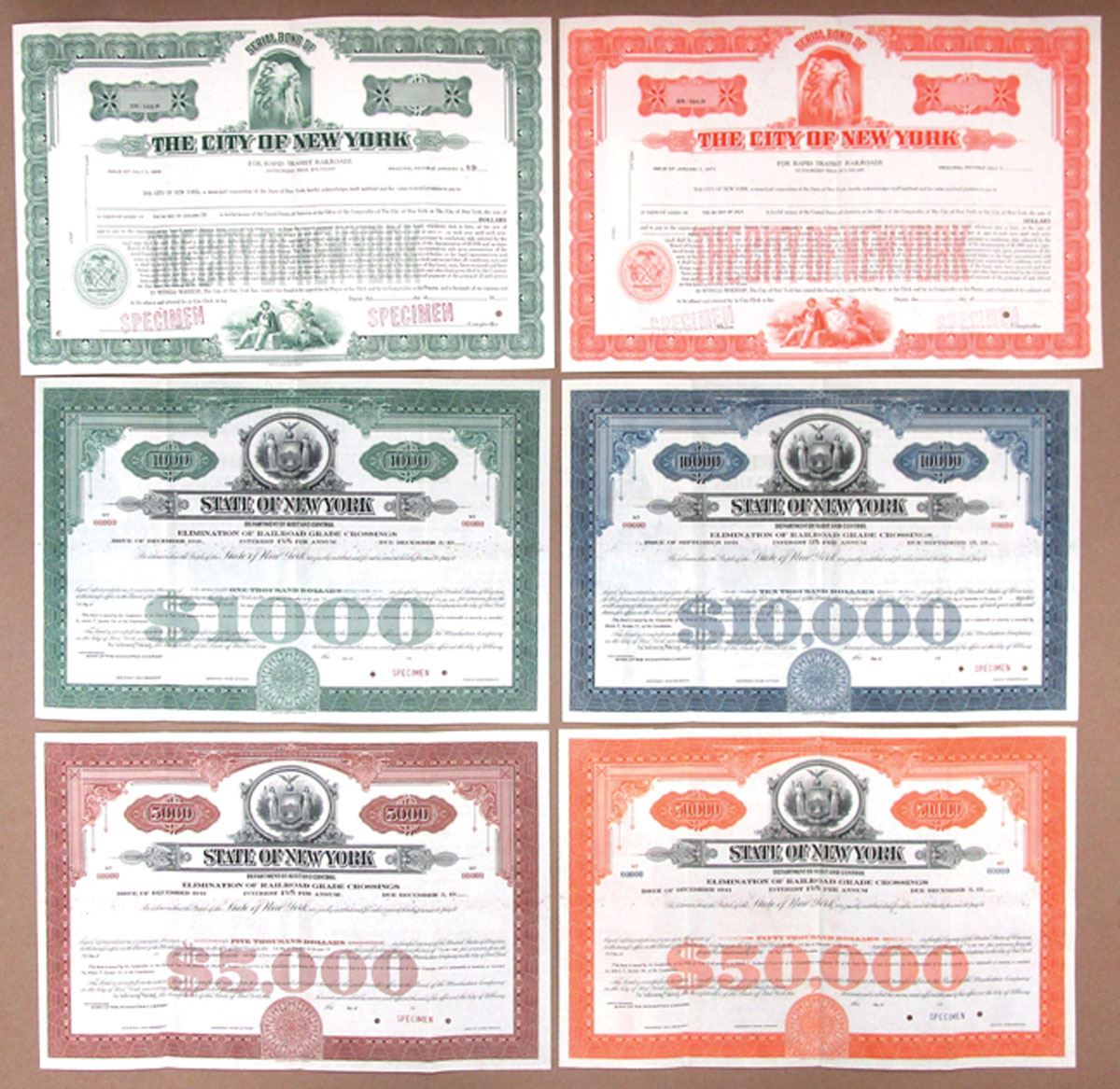 New York, 1931 to 1971. Lot of 6 Specimen Bonds, including 1931 State of New York, Department of Audit and Control $10,000 3% Elimination of Railroad Grade Crossings Registered Bond with blue border; 1941 State of New York, Department of Audit and Control 1.5% Elimination of Railroad Grade Crossings Registered Bonds: $1000 with green border; $5000 with brown border; and $50,000 with orange border; 1969 City of New York, For Rapid Transit Railroads $Odd at 6% with green border; and 1971 City of New York, For Rapid Transit Railroads $Odd at 7% with orange border. All have specimen overprints and POCs. Condition ranges from VF to XF. ABNC. (6).
