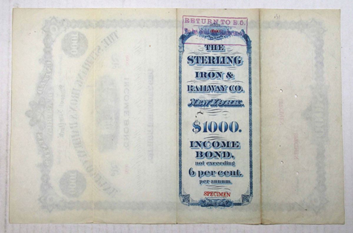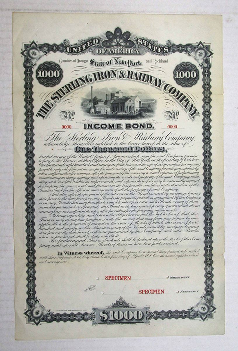 New York, 1876. $1000 Specimen 6% Income Coupon Bond, Black printing with black border and factory at top, Specimen overprints and POCs, VF-XF. ABNC. This is a unique example from the ABN Archives that was found in 2002.