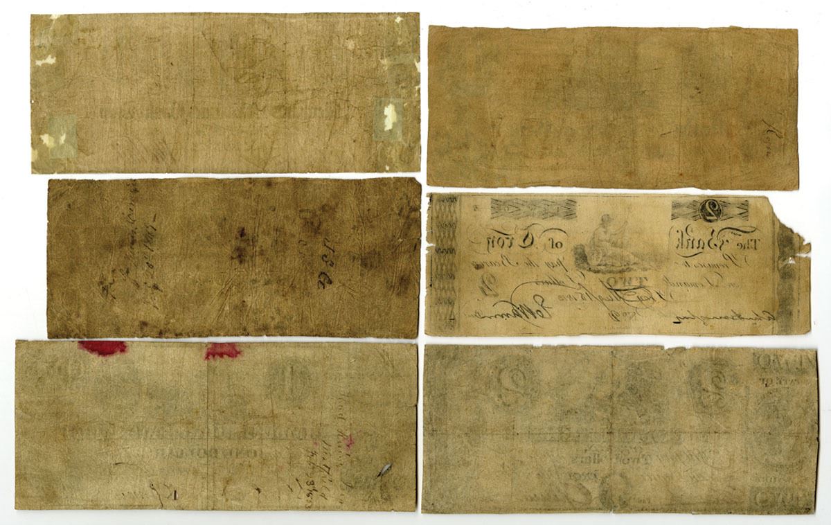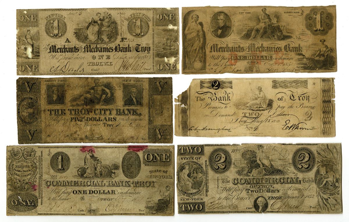 Troy..., New York. Lot includes 6 Obsolete Banknotes from Troy, New York: Troy City Bank, 1847 $5 I/U Banknote; Bank of Troy, 1813 $2 I/U Banknote; Merchants and Mechanics Bank of Troy, 1846 $1 I/U Banknote, Fine with archival repairs; Merchants and Mechanics Bank, 1855 $1 I/U Banknote, Fine-VF condition; Troy City Bank, 1847 $5 I/U Banknote; Commercial Bank of Troy, 1852 $2 I/U Haxby Banknote; Commercial Bank of Troy, 1877 $1 I/U Banknote. All are in VG to Choice Fine condition. (6)