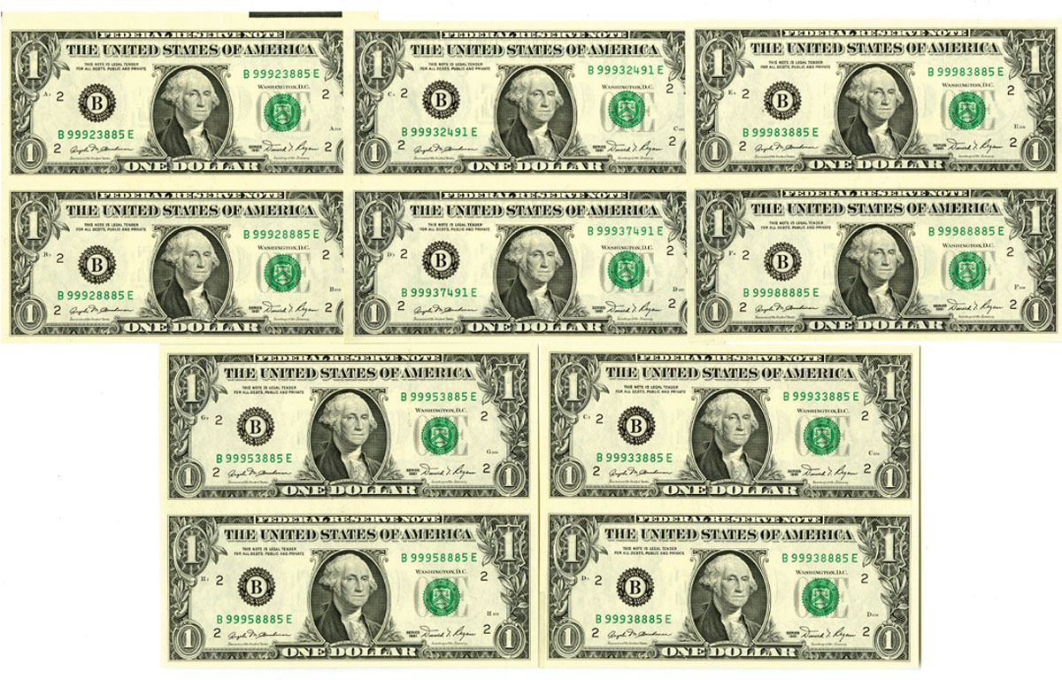 New York, NY, 1981. $1, Series 1981, Fr.# 1911B, Group of 5 Uncut Pairs of Federal Reserve Banknotes, All have green seal at right and Buchanan | Regan Signatures, Unc to Gem Unc condition. (5). Sold "AS IS" no returns accepted.