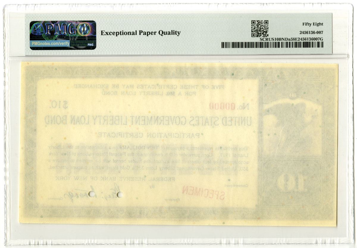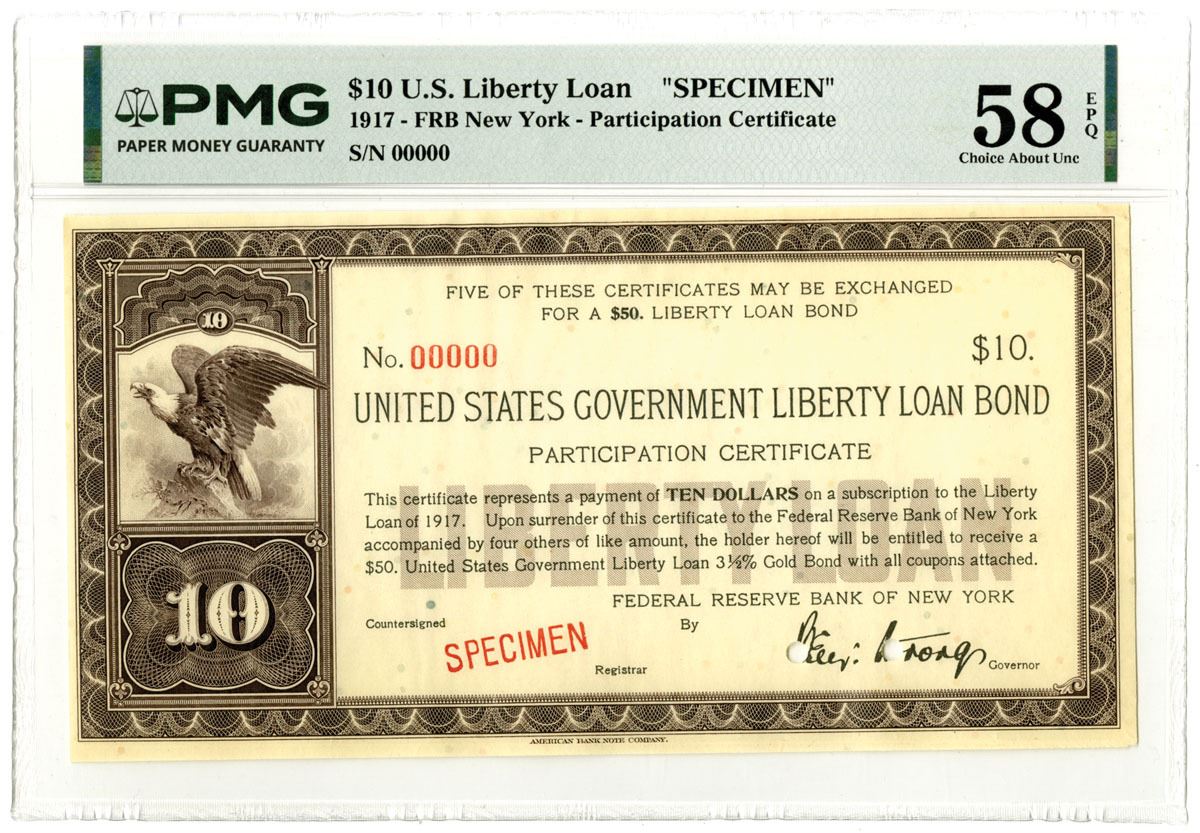 New York, 1917. $10 FRB New York Specimen Participation Certificate, Black print with black border and Bald Eagle at left above numeral, Specimen overprint and POCs, S/N 00000 61215, PMG graded Choice About Uncirculated 58 EPQ. ABNC.