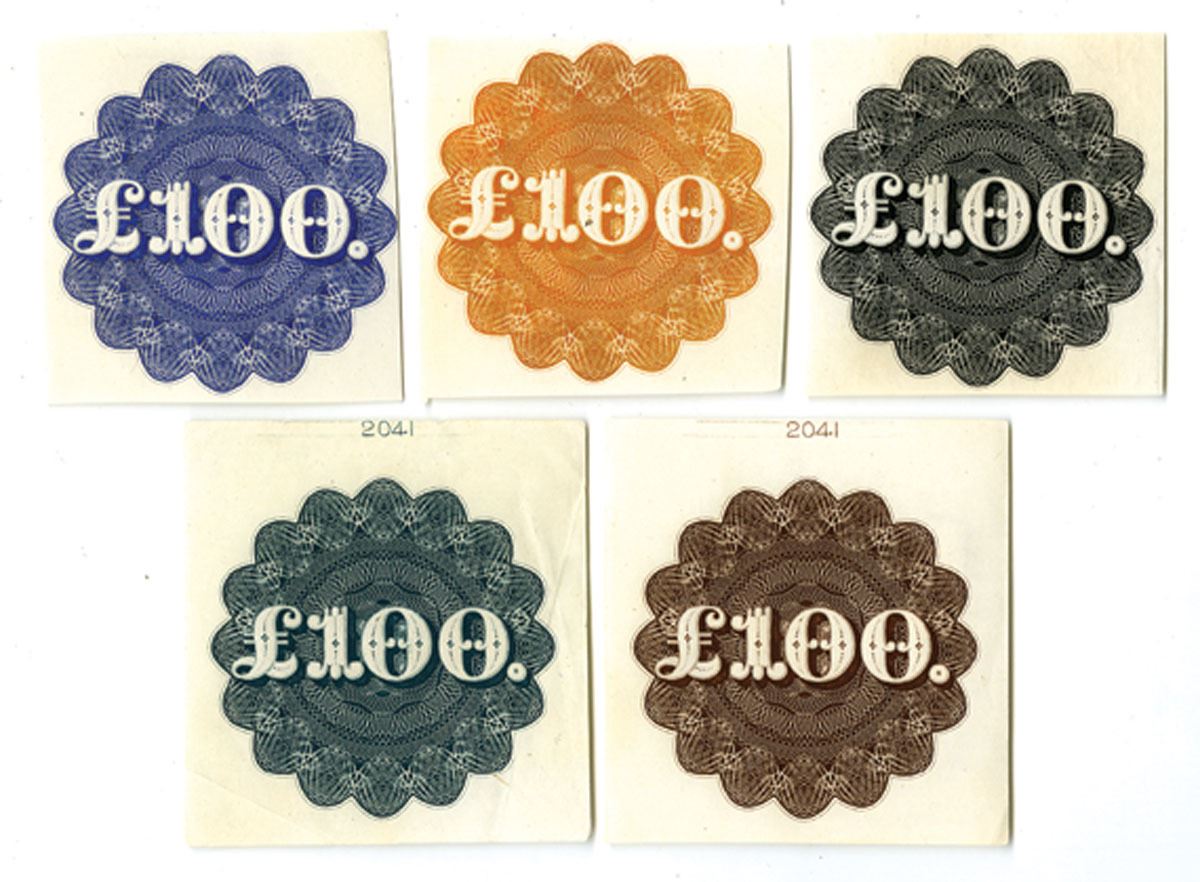 NY & UK, ND (1860-1880s). Lot of 5 "£100" Vignette Numerals used for Pound Denominated Stocks and Bonds in different colors, Vignettes range from AU to Unc condition. NBNC. (5). Sold "AS IS" no returns accepted.