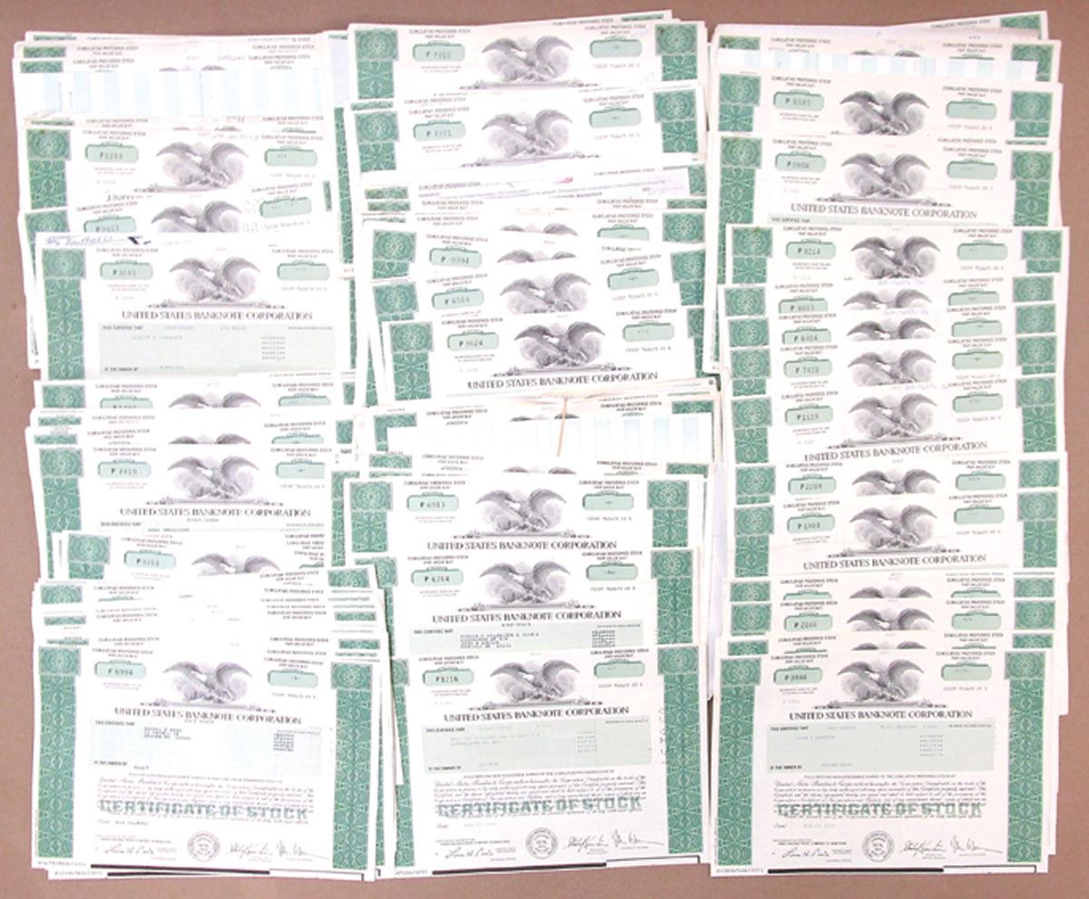 New York, 1990-92. Lot of 370+ I/C Stock Certificates for various share amounts, All are back with green border and underprint and bald eagle at top, Pin punched cancelled at side, VF to XF condition. S-C USBNC. (371). Sold "AS IS" no returns accepted. United States Banknote Corporation is a company that specializes in producing and printing secure documents, including banknotes and stock certificates. Founded in the early 20th century, it has focused on implementing advanced security features to prevent counterfeiting, such as watermarks, holograms, and specialized inks. The corporation has played a significant role in the U.S. currency system, collaborating with government agencies and financial institutions. As technology and security needs evolved, the company adapted its offerings to remain competitive, expanding into commercial and governmental applications. Overall, United States Banknote Corporation is recognized for its innovative printing techniques and commitment to the integrity of financial transactions.