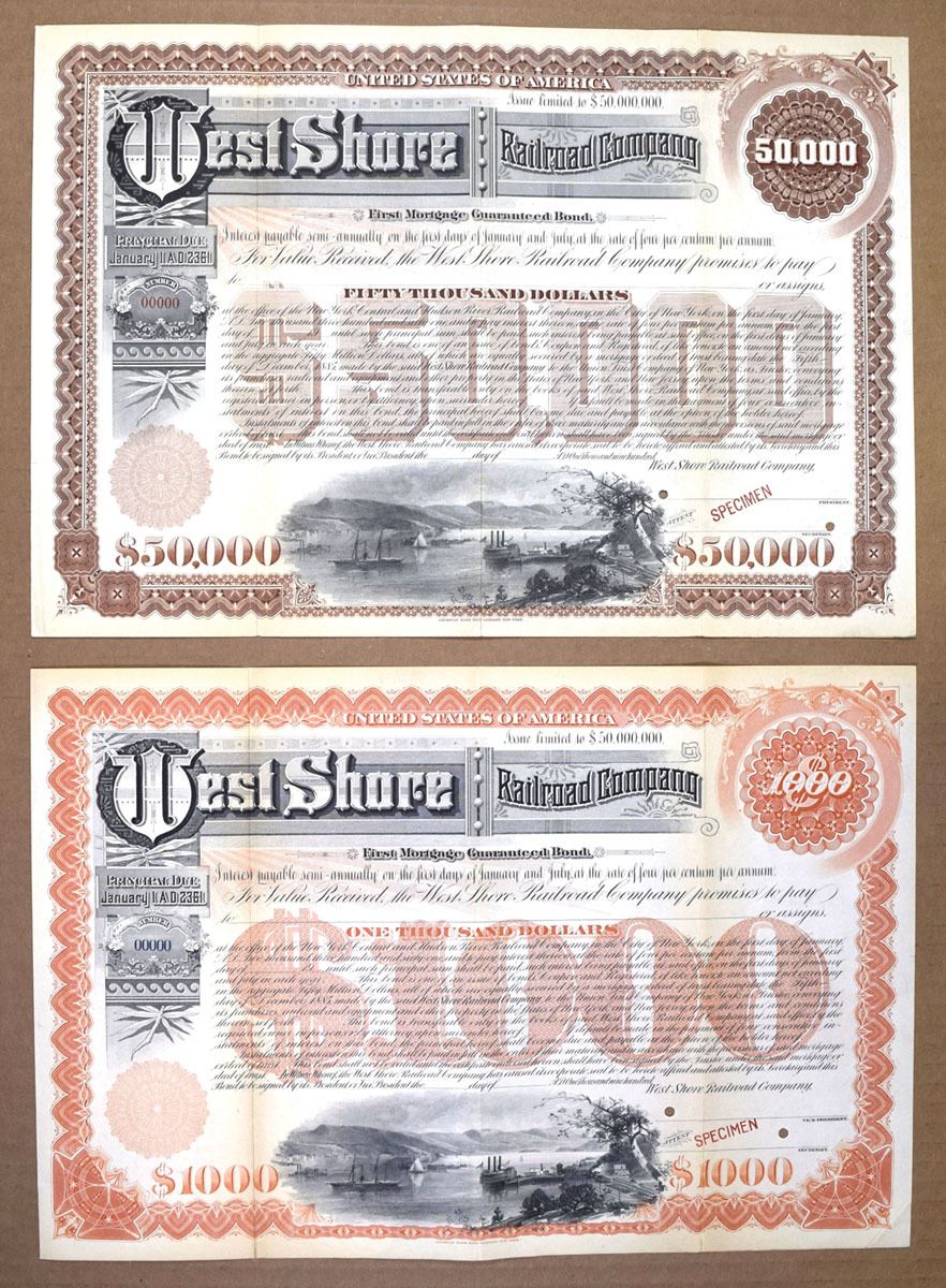 New York, ND (1885). Lot of 2 Specimen Registered Bonds, Includes: $1000 with orange border and $50,000 with brown border. Both have Specimen overprints and POCs and are in Fine to VF+ condition, ABNC. (2). Sold "AS IS" no returns accepted.
