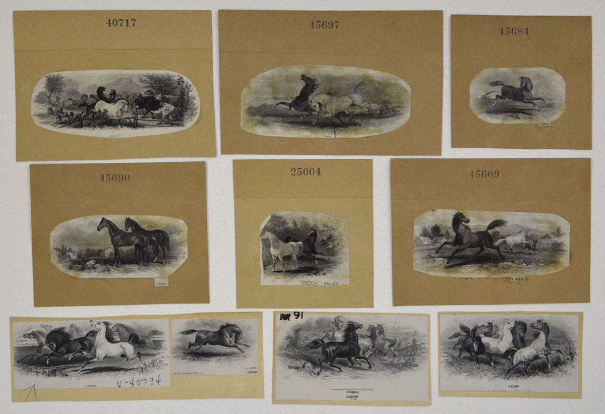 New York, ND (ca. 1850-1880s). Lot of 10 Proof Vignettes featuring Wild Horses used on Obsolete Banknotes, Stocks, Bonds, Checks, Letterheads, and more, Printed in Black and white on India paper that is mounted on manilla paper, Used by National Bank Note Co., American Bank Note Co., Rawdon, Wright, & Hatch, and other security printing companies, Vignettes are in XF to Uncirculated condition with some glue stains. (10). Sold "AS IS" no returns accepted.