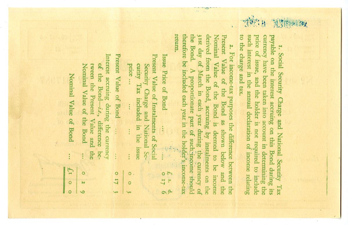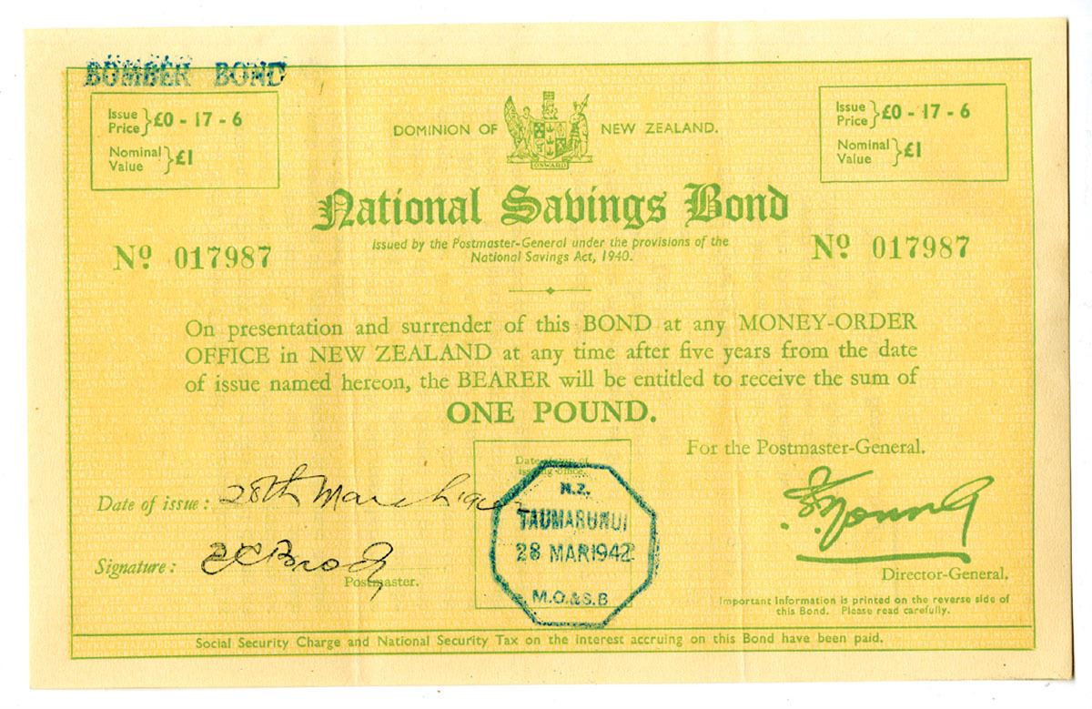 Taumarunui, New Zealand, 1940 (Issued 1942), 1 Pound, P-Unlisted, Green on light yellow underprint, Blue hand stamp "Bomber Bond" at upper left and hand stamps "N.Z. - Taumarunui - 28 Mar 1942 - M.O. & S.B." on bottom middle. Small N.Z. arms top center. S/N 017987, XF to AU condition. Rare WW II Military Savings Bond.