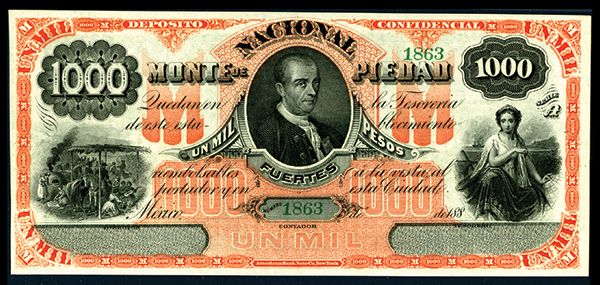 Nacional Monte De Piedad, 1880-81 Certificates Issue. Mexico, 188x, 1000 Pesos, Ser.A, P-S271r1, Remainder without counterfoil, PMG graded Choice Uncirculated 64 EPQ, Black on orange underprint, back green. Scarce higher denomination from this series. ABNC.