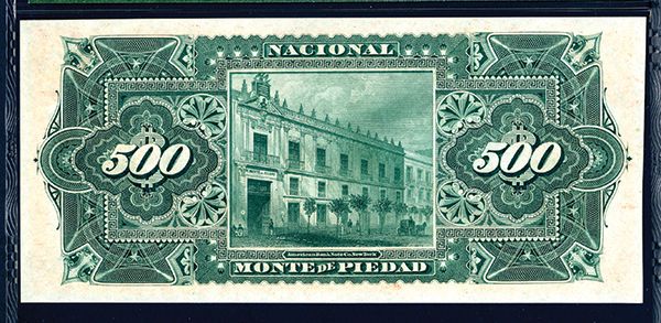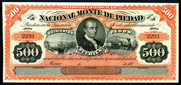 Nacional Monte De Piedad, 1880-81 Certificates Issue. Mexico, 188x, 500 Pesos, Ser.A, P-S270r1, Remainder without counterfoil, PMG graded Gem Uncirculated 65 EPQ, Black on orange underprint, back green. Scarce higher denomination from this series. ABNC. This is the finest graded by far of the 3 listed in the PMG census.
