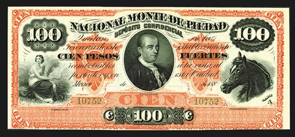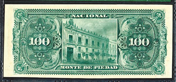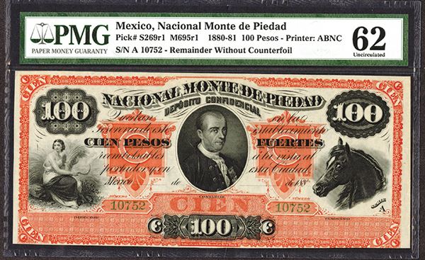 Mexico, 188x, 100 Pesos, Ser.A, P-S269r1, Remainder, PMG graded Uncirculated 62 condition, Black on orange, back green. No Counterfoil. Scarce higher denomination from this series. ABNC.