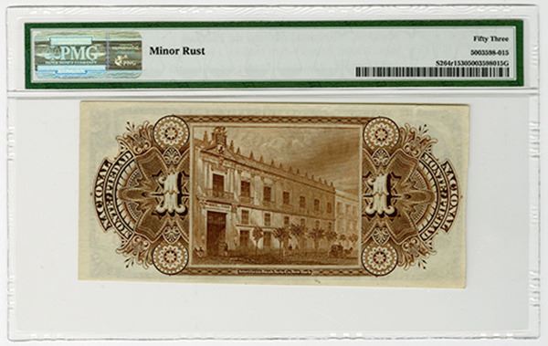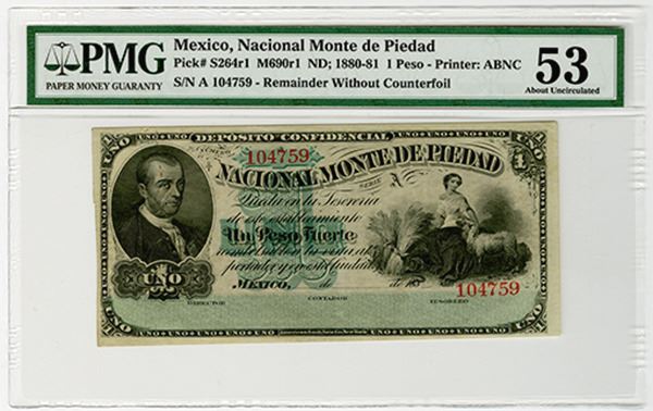 Mexico. Remainder 1 Peso, 1880-1881, P-S264r1. PMG graded About Unc 53 with comment "Minor Rust" (Cert # 5003598-015). ABNC.