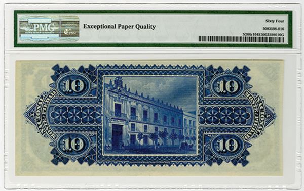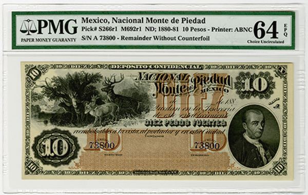Mexico. Remainder 10 Pesos, 1880-1881, P-S266r1. PMG graded Choice Unc 64 EPQ (Cert # 5003598-016). ABNC. Only one other note has been offered at auction in this high grade, none higher.