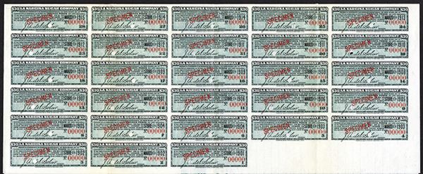 New York. $1000 Specimen 6% Mortgage Spanish Gold Coupon Bond or its equivalent in American Gold. Certificate is in Horizontal format and written in English and Spanish. Black print with green border and under print. Vignette of men rolling a large barrel at top left of certificate. Red SPECIMEN, POC's and s/n "00000", XF condition with all coupons attached, ABNC.