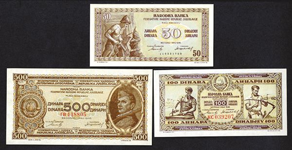 Yugoslavia. 50, 100, 500 Dinara. P-64b, 65b, 66b. Last two with security thread. All Choice Uncirculated. 3 pieces.