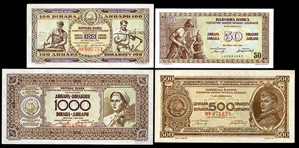Narodna Banka, 1946, Quartet of Issued Banknotes Yugoslavia, lot of 4, includes 50-, 100-, 500-, and 1000 Dinara, P-64 to P-67. The 100 Dinara VF, the rest UNC.