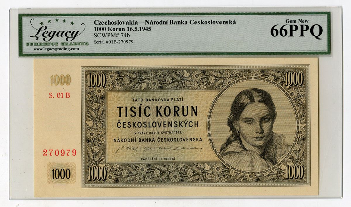 Czechoslovakia, 1945.. 1000 Korun, P-74b, Issued Banknote, Dark grayish brown on gray underprint, Head of Jana Dvorakova by Josef Manes at right, Back is blue with red-orange and m/c printing with arms at center, S/N 01B-270979, Legacy graded Gem New 66PPQ, TB.