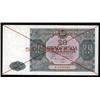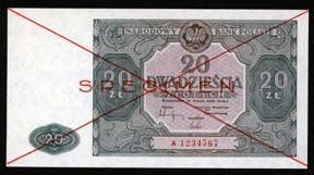 Warszawa. May 15, 1946. 20 Zlotych, P-127 Unlisted specimen banknote. Green and brown on face, back green and brown with airplane in middle. "Specimen" overprint with red "X" on face and back and "A 1234567" serial number. Paper is watermarked. Uncirculated to CU condition. Rare as specimen.