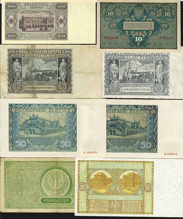 Poland. 10, 1,000,000 Marek; 20, 50 Zlotych. P-25, 37, 71, 77, 95, 102 (2), 138. Mostly Very Good to Very Fine. 8 pieces.