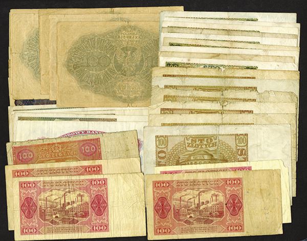 Poland. 100 Marek or 100 Zlotych group. SCWPM 17 (5), 27 (9), 75 (9), 97 (6), 103 (4), 117, 129, 139 (4). Mostly Good-Very Good, some with paper loss or separation. 39 pieces