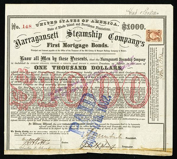 Massachusetts. $1000 7% 1st Mortgage Issued Bond. No vignette. Black border with red $1000 in middle and blue PAID in middle. Signed by Onslow Stearns as trustee, he was 34th governor of New Hampshire. This bond was issued and possibly helped finance the merger ofÊ the Narragansett Steamship Company with the Boston, Newport and New York Steamboat Company. Ambrose Burnside signature as President. Well known Civil War general, he was the 30th Governor as well as being a U.S senator from Rhode Island.
