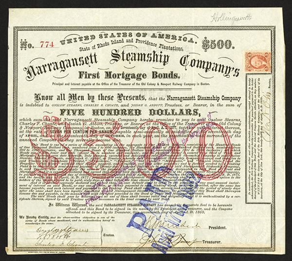 Massachusetts. $500 7% 1st Mortgage Issued Bond. No vignette. Black border with red $1000 in middle and blue PAID in middle. Signed by Onslow Stearns as trustee, he was 34th governor of New Hampshire. This bond was issued and possibly helped finance the merger ofæ the Narragansett Steamship Company with the Boston, Newport and New York Steamboat Company. Ambrose Burnside signature as President. Well known Civil War general, he was the 30th Governor as well as being a U.S senator from Rhode Island.