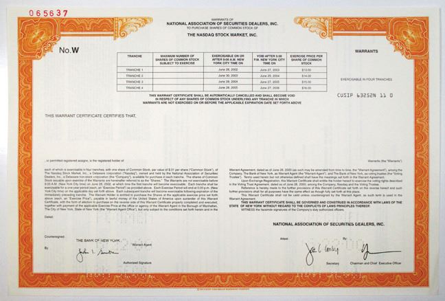 Delaware, 2000. Odd Warrants Specimen Warrant Certificate, Black text with orange border. Specimen POCs. VF condition, SCBN. The Nasdaq Stock Market is an American stock exchange based in New York City. It is ranked second on the list of stock exchanges by market capitalization of shares traded, behind the New York Stock Exchange.
