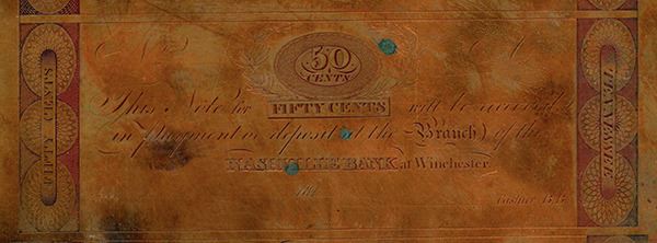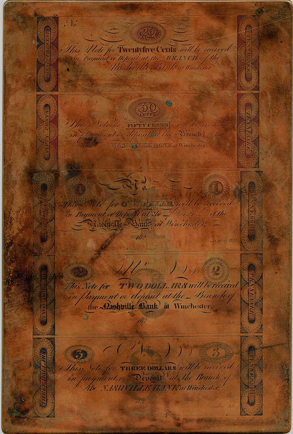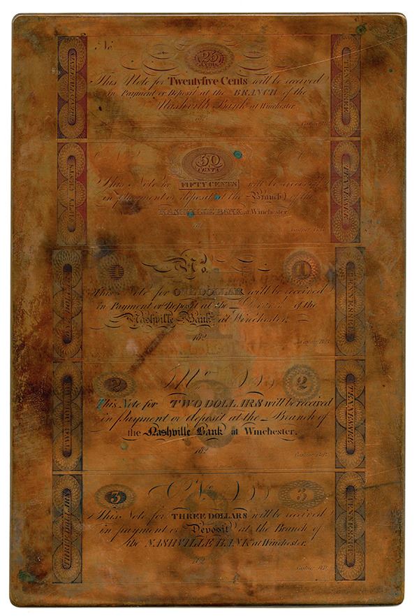 Nashville (at Winchester), Tennessee, 182x (1820-24), Copper printing plate with 5 different banknotes. Includes 25cts-50cts-$1-$2-$3, (TN-180-Unlisted). No 25 Cents; 50 Cents or $3 denomination notes are known on this bank, Unlisted design, printer, and denominations only add to the desirability of this amazing and unique printing plate from the 1820's, the back is blank, the plate is in amazing shape with original golden-red patina with evidence of a cleaning sometime in the distant past. The 25 Cents and 50 Cents notes have a denomination counter in the top middle and end panels with Tennessee and the denomination; the $1, $2 and $3 notes have a place for the serial number at the top middle and an underprint of the numeral denomination for that note and also similar end panels as the lower denomination, all are payable at Winchester. 8.5 by 12.5 inches, Unique copper printing plate from a new estate find. This banknote plate was engraved by William Kneass, the Chief Engraver of the U.S. Mint. He ran an engraving office on Fourth above Chestnut Street, Philadelphia, which was a popular meeting place for "leading wits and men of culture" up until he was appointed the second Chief Engraver of the United States Mint on January 29, 1824 until his death in 1840. In 1834, Kneass designed the Classic Head motif which appeared on Quarter Eagle ($2.50) and Half Eagle ($5.00) gold pieces from 1834-1839. He also modified John Reich's Capped Bust design on the dime through half-dollar for the years 1829-1837. Additionally, Kneass utilized his modified Capped Bust for the rebirth of the half-dime in 1829. He also introduced a new Liberty head on the half dollar, a design that was modified several times over the next two years, The printer is W. Kneass, Philadelphia. Historic obsolete banknote plate engraved by legendary U.S. Mint engraver.