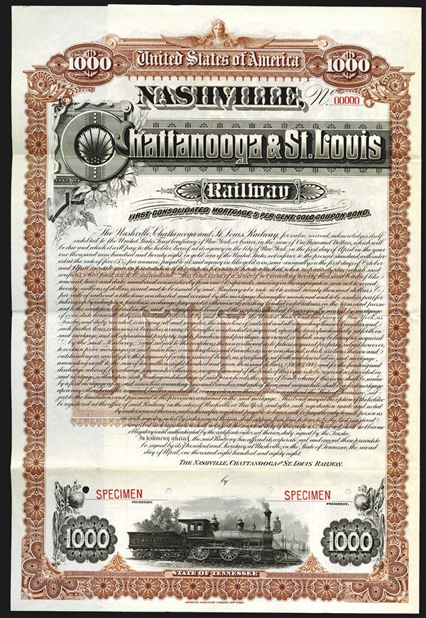 Tennessee, $1000, Specimen 1st Consolidated Mortgage 5% Gold Coupon Bond, Black on brown border and underprint, Moving locomotive l-r bottom center, Red SPECIMEN overprints POC's, VF condition, ABNC. Listed railroad unlisted bond in Cox.