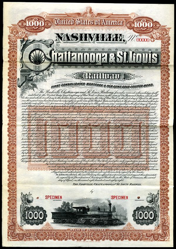 Nashville, Chattanooga & St.Louis Railway Co. 1888 Specimen Bond. Tennessee, 1888, $1000, Specimen 1st Mortgage 5% Gold Coupon Bond, Black on red-brown border and underprint, Train America L-R on bottom with ornate title on top, Specimen overprint, POC's, Coupons attached, XF condition. ABNC. Only known as a specimen bond in Cox.