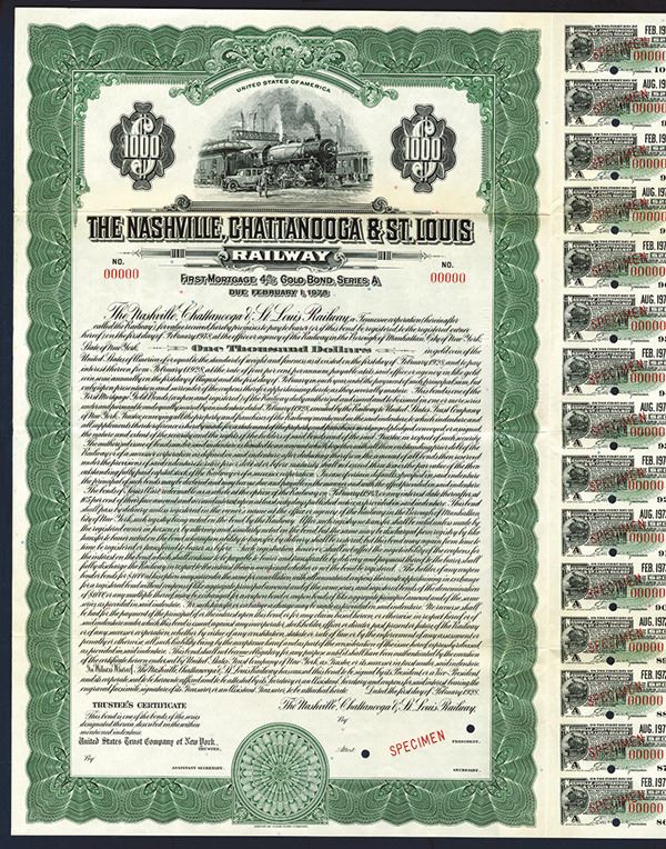 Tennessee. $1000 First Mortgage 4% Specimen Gold Bond, Series A, green frame and underprint, commuter walks away from train at station near big city, ABNC, EF. Only known as a Specimen in Cox.