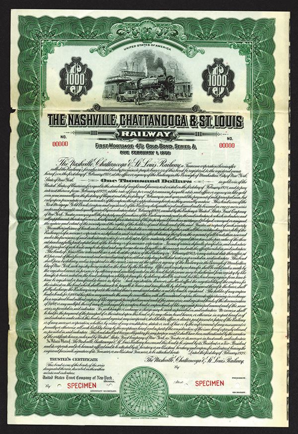 Tennessee, 1928, $1000, 1st Mortgage 4% Gold Coupon Bond, Series A, Specimen. Black on Green border and underprint. Locomotive at station with car and man in front. Fine condition with some chipping on the left margin. Red specimen overprints, POC's and "00000" serial numbers. Only known as a specimen in Cox. ABNC.