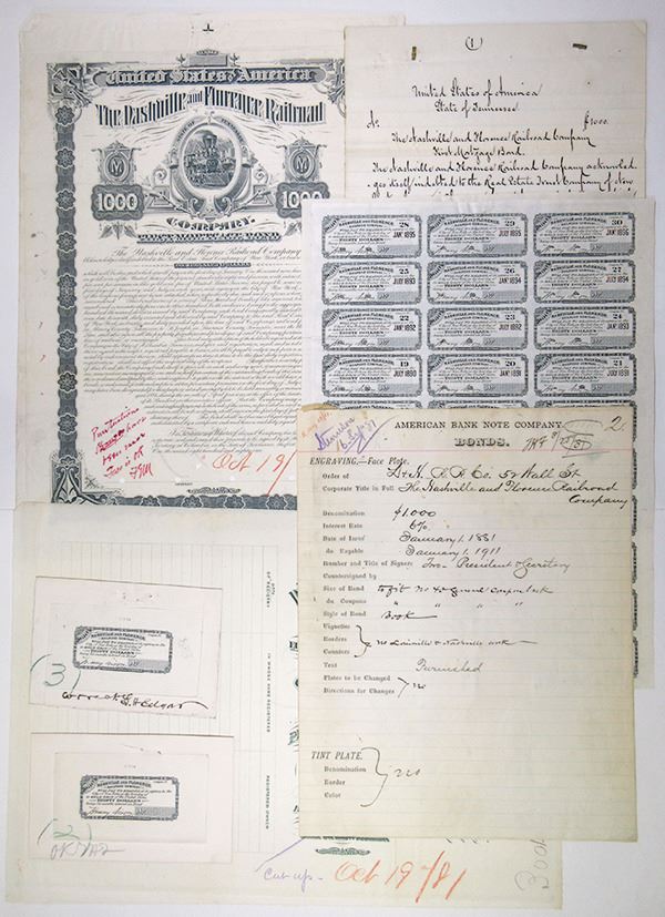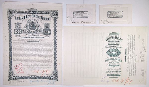 Tennessee. $1,000, bond, train l-r at station in oval, horizontal format, 1st mortgage, bearer coupon, 6%, 30-yr, 1881, due 1911, by ABN.