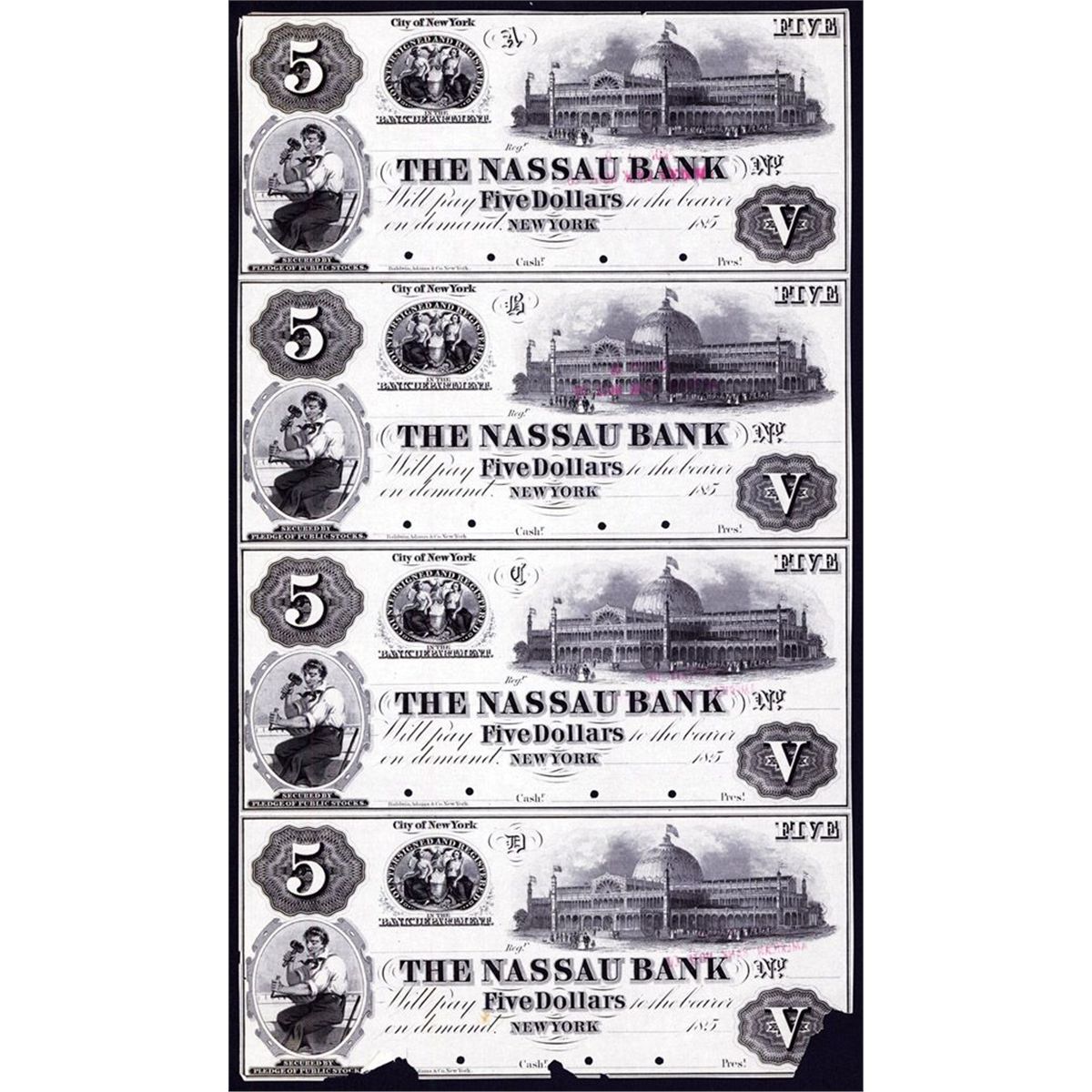 New York, NY, 18xx (ca.1850's), $5-$5-$5-$5; Plates A; B; C; D, NY-1780-G8-G8-G8-G8, All are SENC notes, Black on india paper no protector or overprints, New York Crystal Palace on middle-upper right and stone cutter on lower left with New York Registration on top left middle. The top note has a very small cornewr issue but the next 2 notes are Choice Uncirculated, the bottom note has pieces missing from the bottom border and corners. All with small POC's and light red-pink overprints on back that have bled through in a few areas, BA imprint.