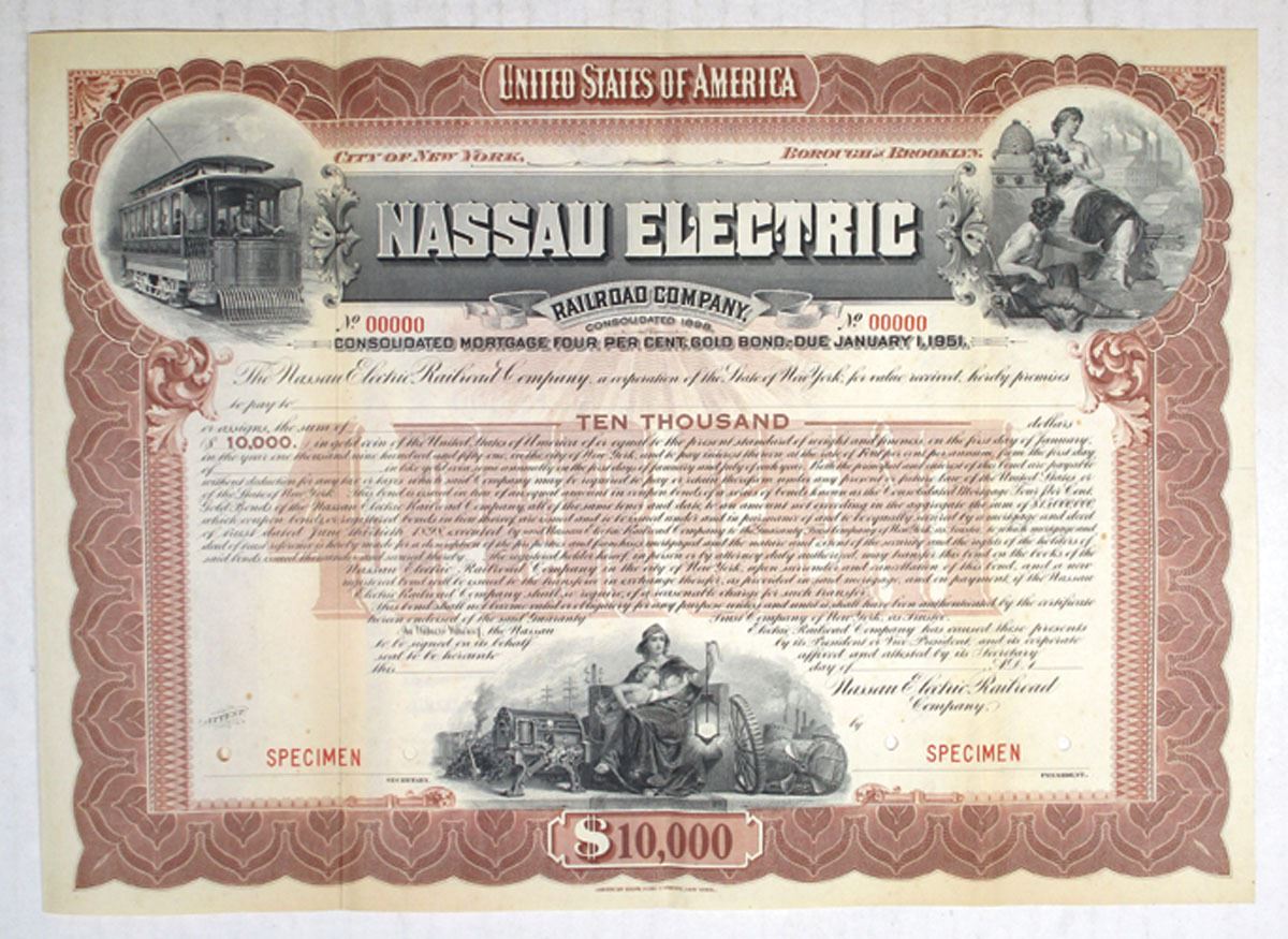 Brooklyn, New York, 1901. $10,000 Registered 4% Specimen Consolidated Mortgage Gold Bond, Black print on brown border and underprint, Multiple vignettes, including allegorical figures and electric rail car, Specimen overprints and POCs, XF condition, ABNC.