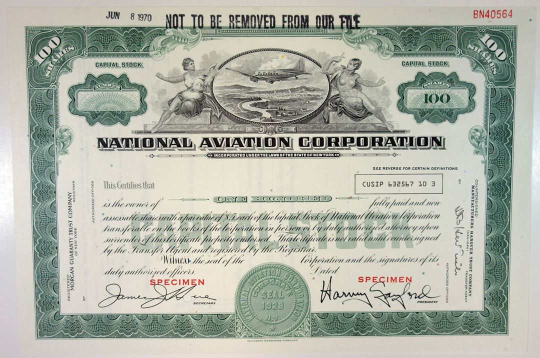 New York, Specimen Stock Certificate, 100 Shares, Black on green border and underprint, Prop plane top center flying over farm and river, Specimen overprints, POC's, VF-XF condition, ABNC.