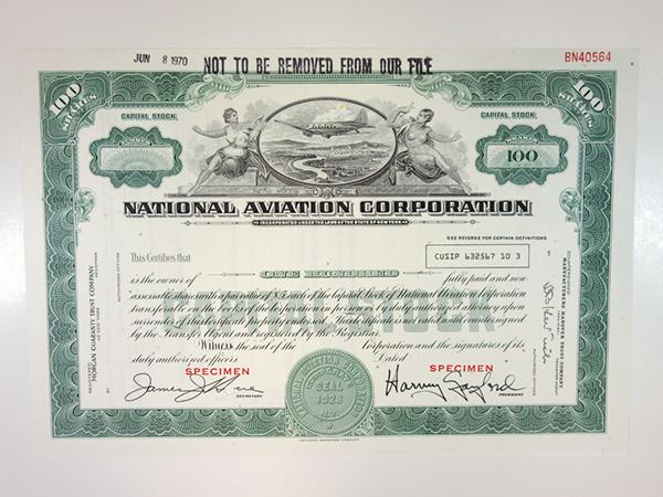 New York, Specimen Stock Certificate, 100 Shares, Black on green border and underprint, Prop plane top center flying over farm and river, Specimen overprints, POC's, VF-XF condition, ABNC.